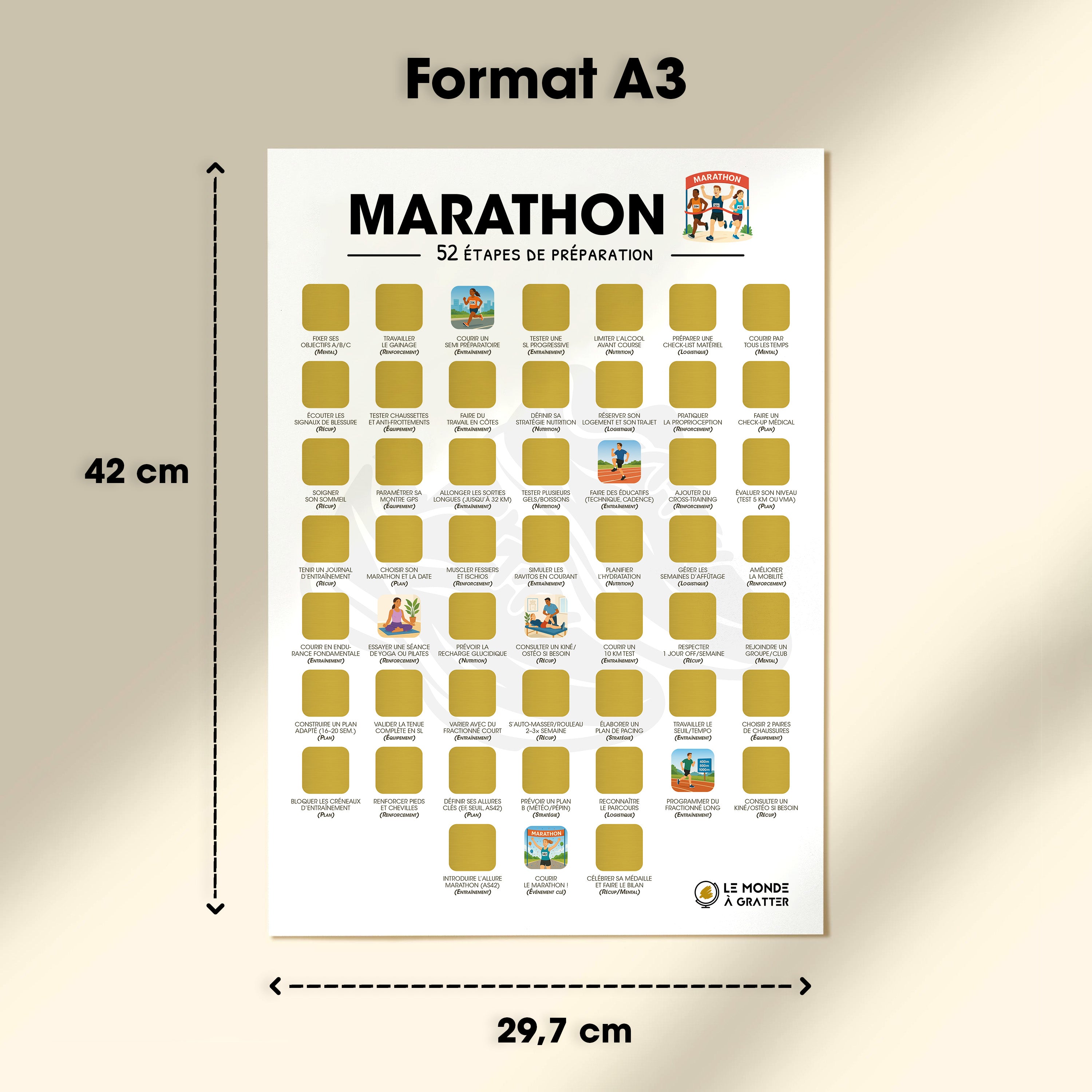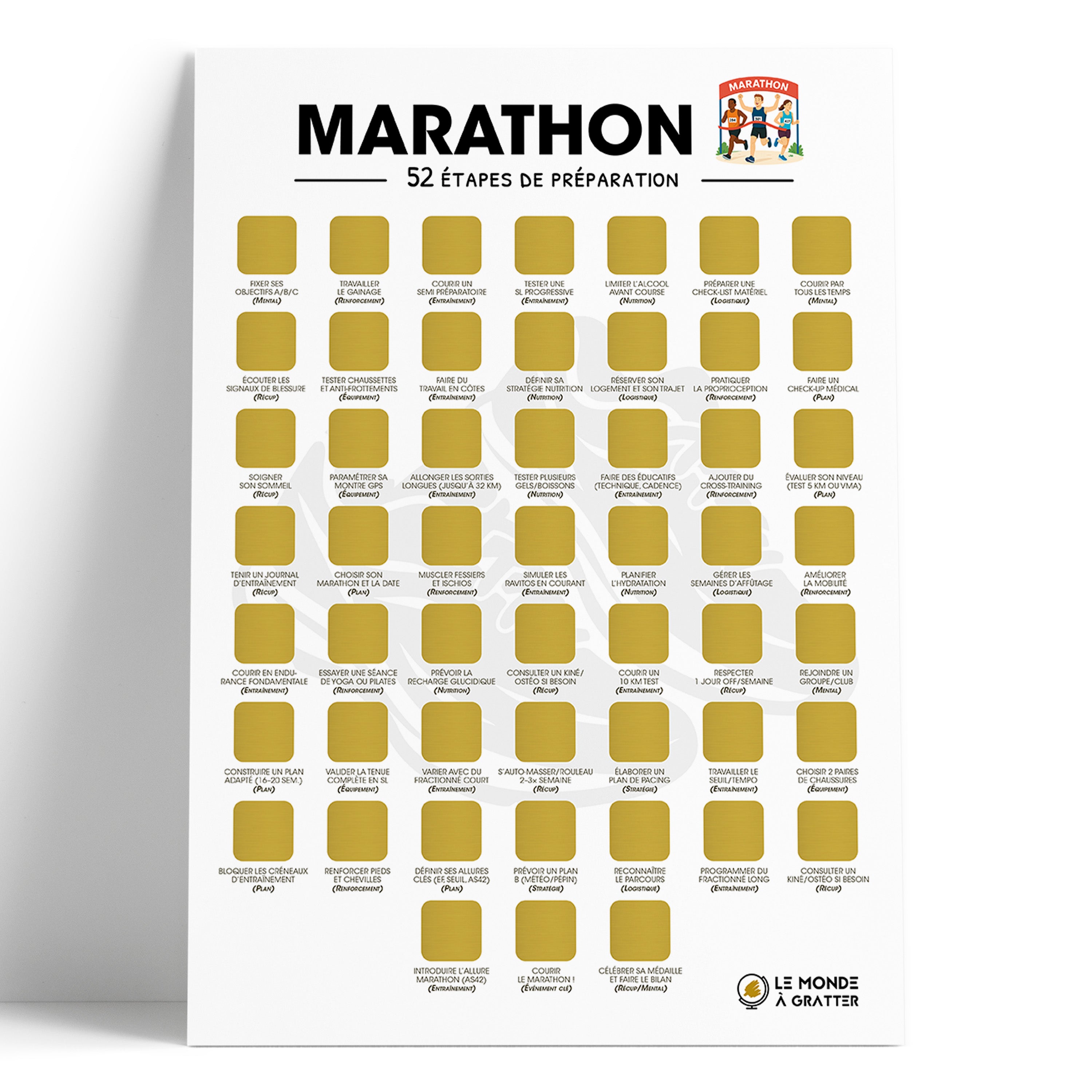 Vous cherchez un cadeau motivant pour un coureur ou vous préparez votre premier marathon ? Ce poster à gratter transforme chaque étape de la préparation en victoire visuelle. Avec 52 cases à gratter, il accompagne l’athlète (débutant ou confirmé), tout au long de son parcours, de la première sortie au jour J. Un coach mural à afficher fièrement et à compléter à son rythme.