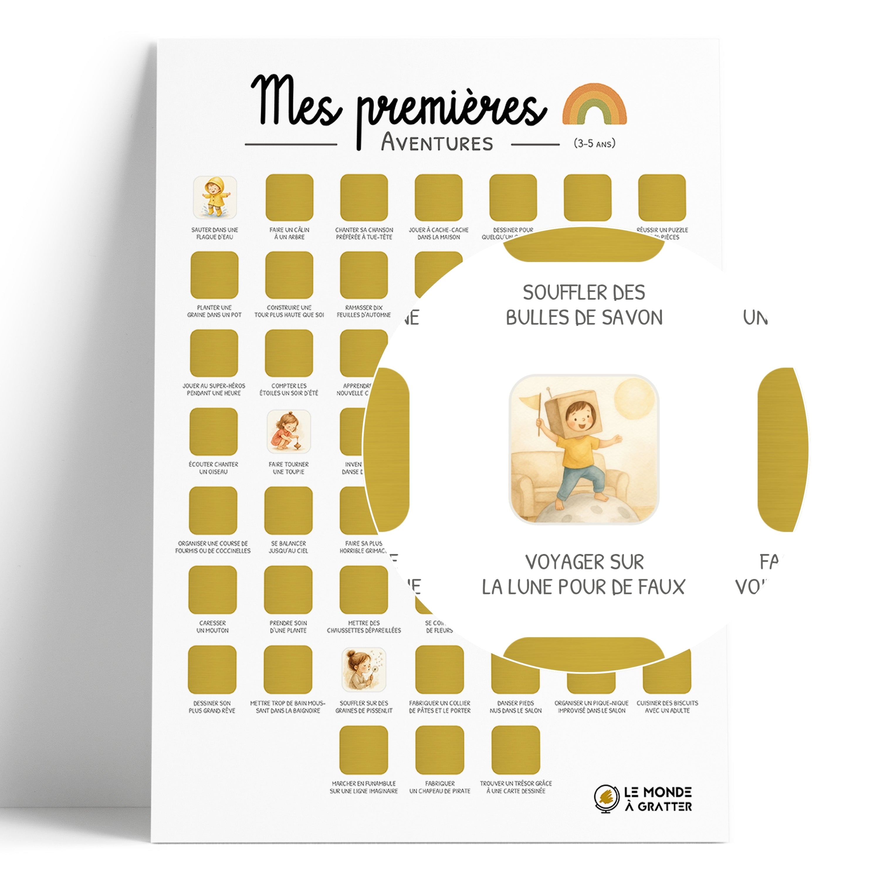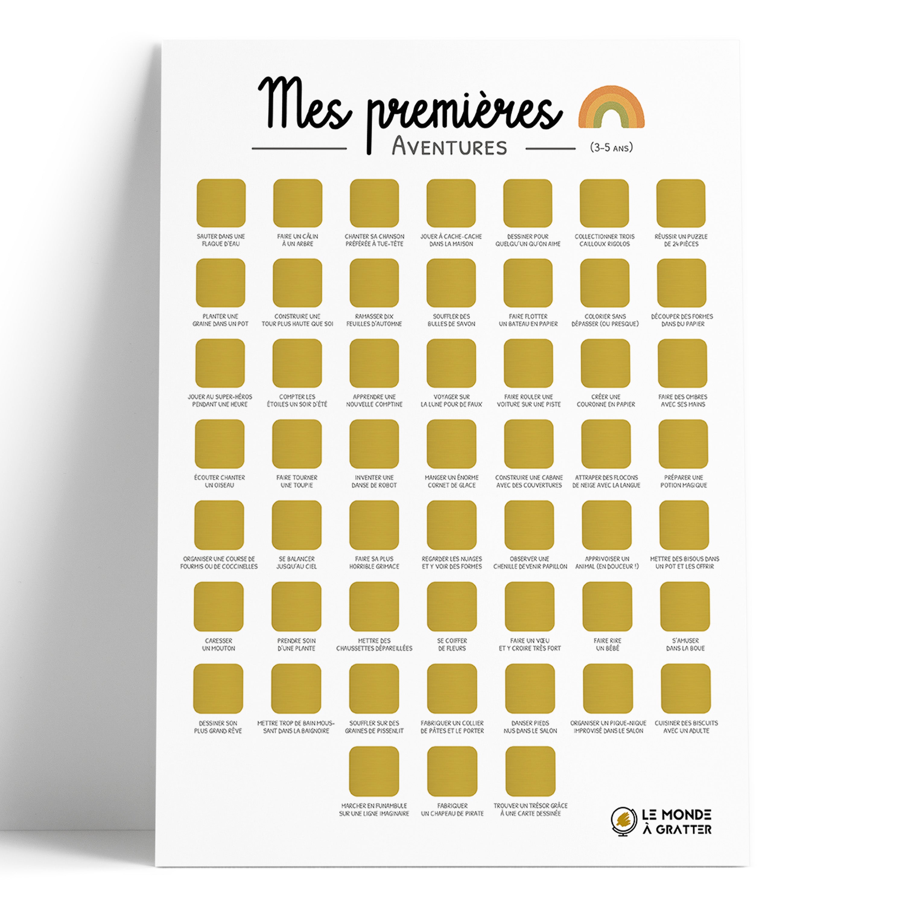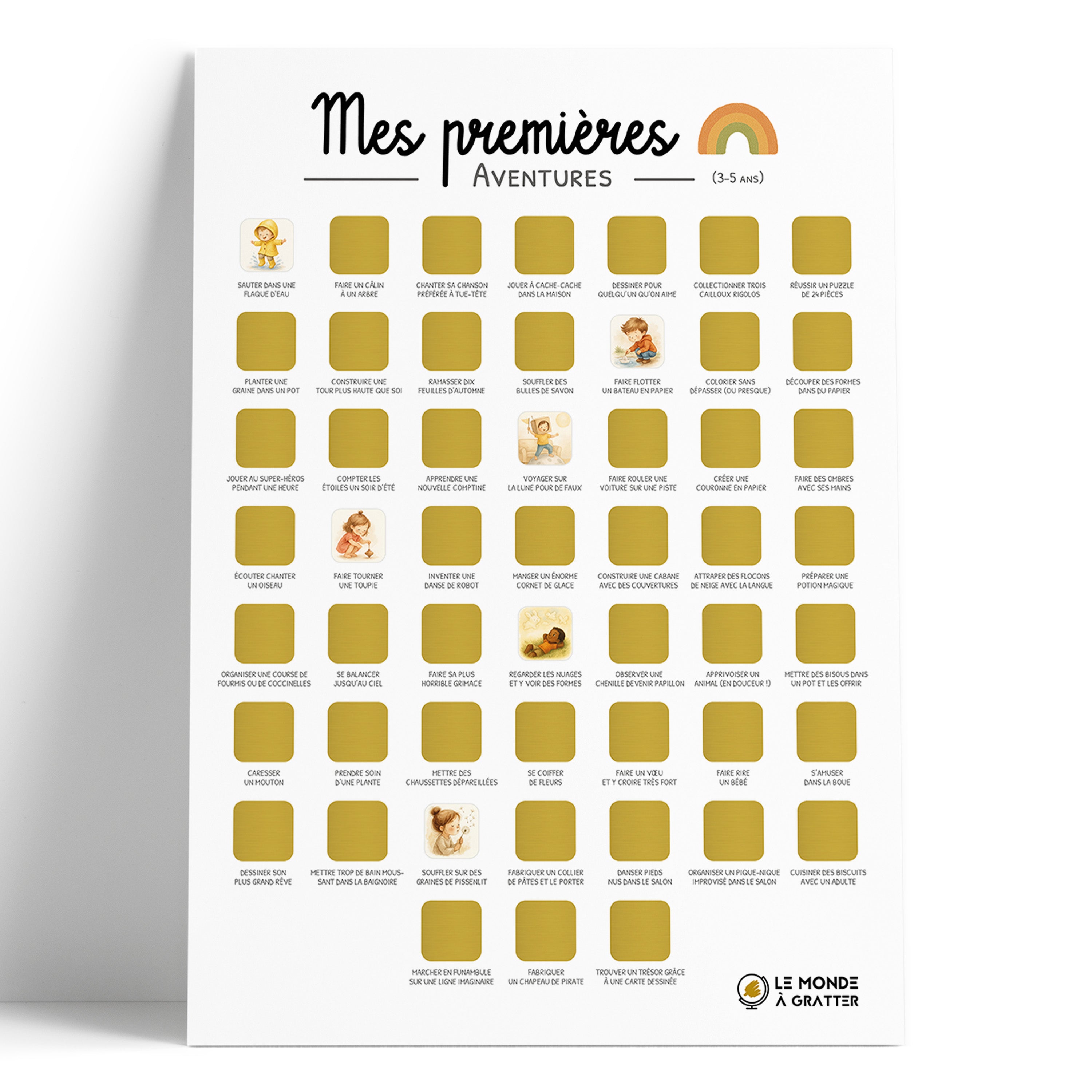 Le principe est simple : chaque fois que l’enfant réalise une activité, il gratte la case correspondante. Les illustrations exclusives apparaissent au fur et à mesure, créant une belle fresque de souvenirs. Pas besoin de suivre un ordre précis : vous choisissez selon l’envie ou la saison. Une fois rempli, le poster devient une jolie décoration murale et un témoin des petits bonheurs du quotidien.
