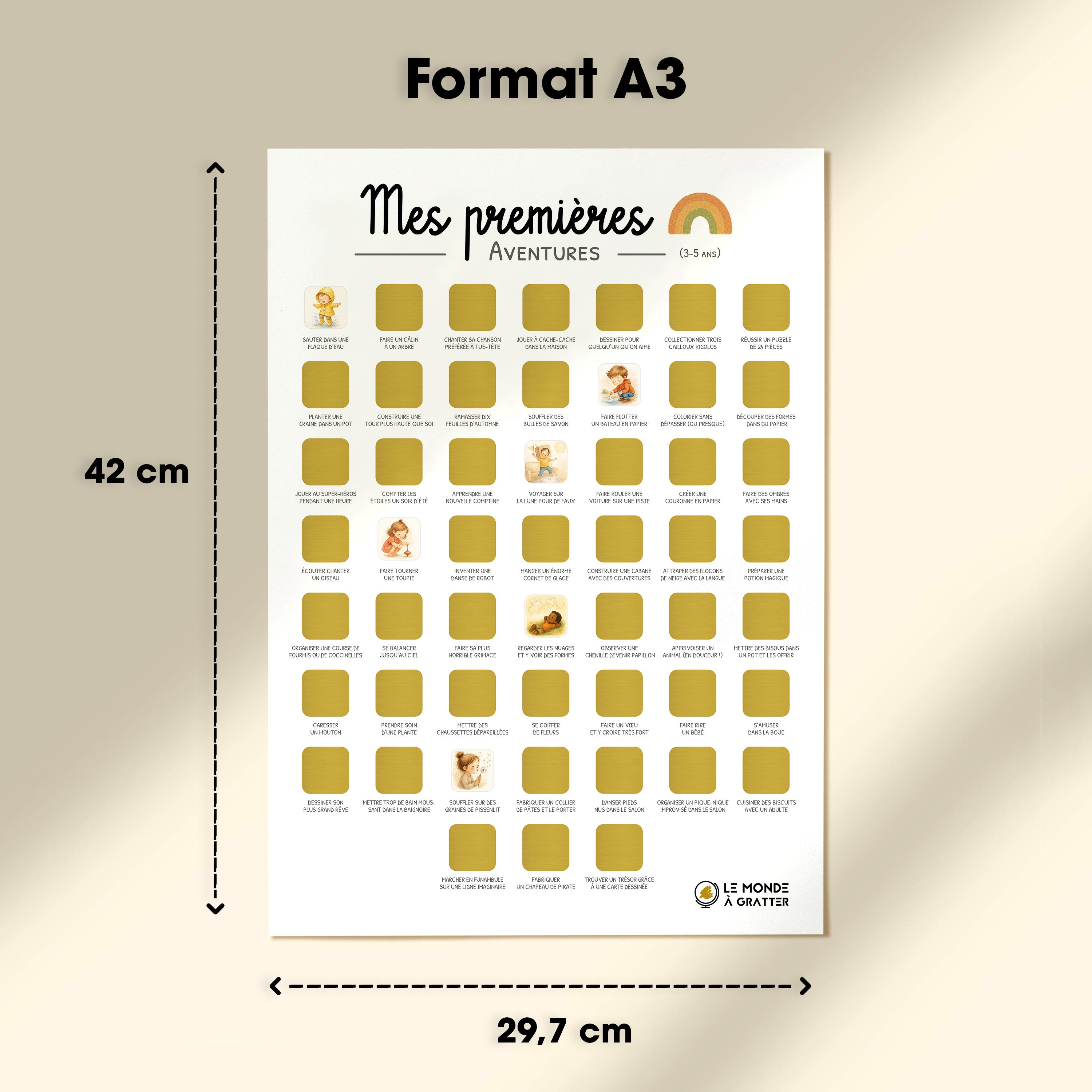 Vous cherchez un cadeau original pour un enfant de 3 à 5 ans ? Ce poster à gratter a été conçu comme un jeu éducatif doux et joyeux, pour accompagner les jeunes enfants dans leurs découvertes. Il propose 52 activités simples à vivre ensemble : l’enfant réalise l’activité, puis gratte la case correspondante. Une façon ludique de créer des souvenirs, développer sa curiosité et décorer sa chambre.