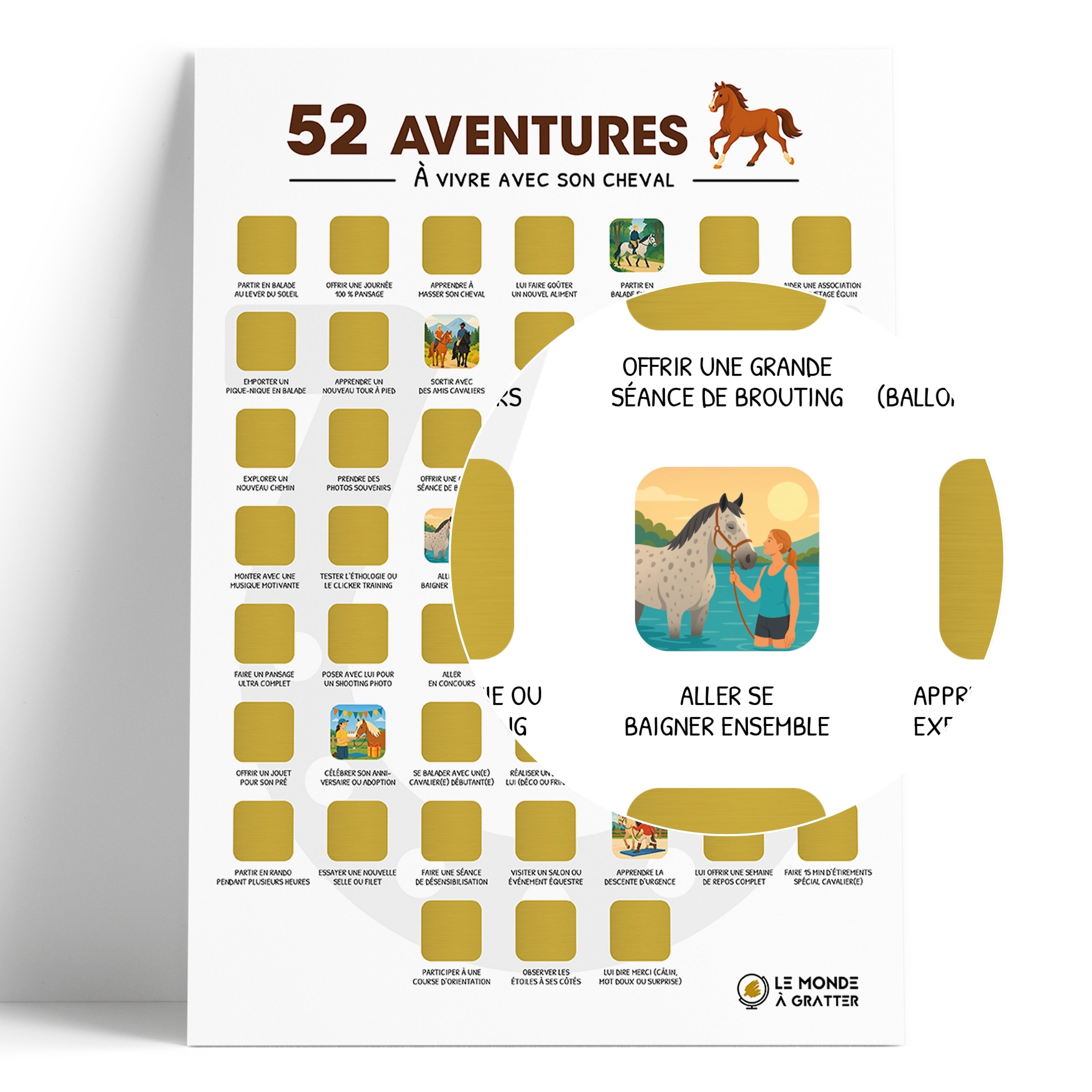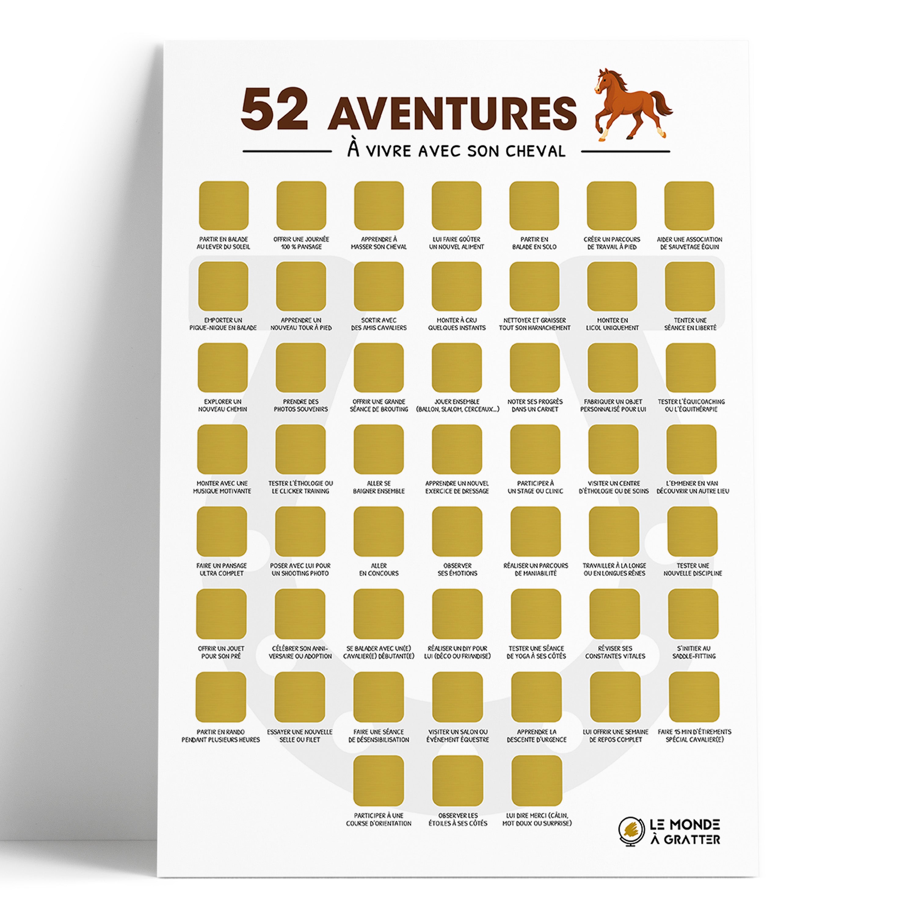 Que vous cherchiez une idée cadeau pour une cavalière/un cavalier, ou que vous vouliez vivre plus de beaux moments avec votre cheval, ce poster à gratter propose 52 idées à réaliser à votre rythme. On vit le moment, on gratte la case, et la déco garde la trace de votre histoire.